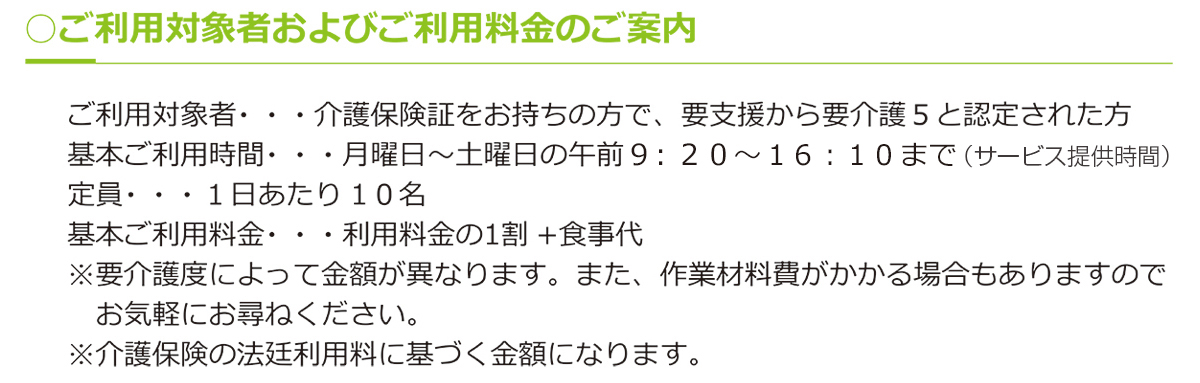 - 定員10名で、ひとりひとりの利用者様としっかりコミニュケーションがとれる体制を大切にしています。